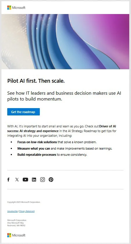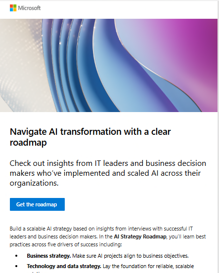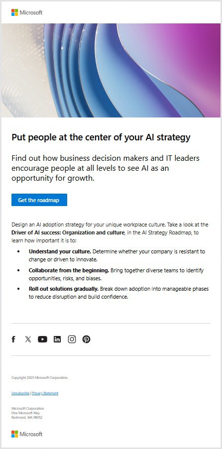 For business leaders trying to implement AI across their organizations, or even in just a single department, it can be difficult to know where to start and how to keep momentum going. This email series promoted an AI roadmap that offered practical advice across all phases of AI adoption. The first email introduced the roadmap, and the remaining three each focused on a different key aspect of successful AI implementation.