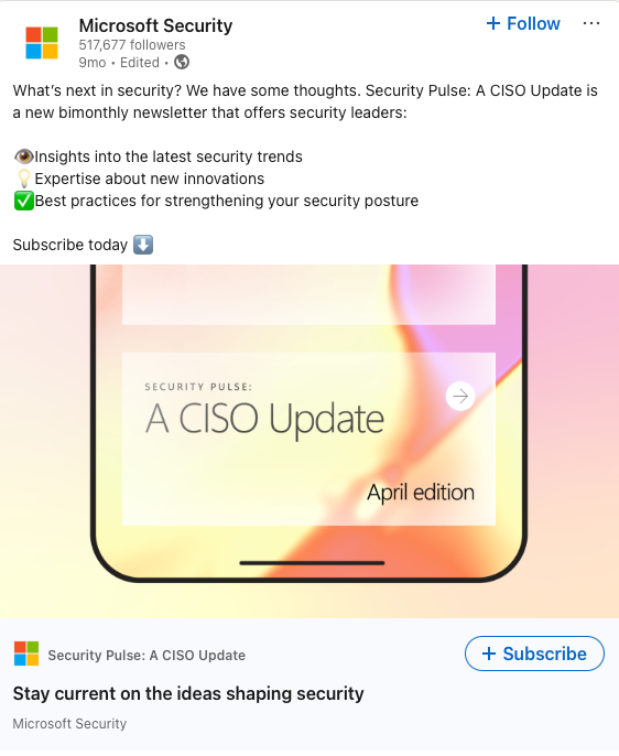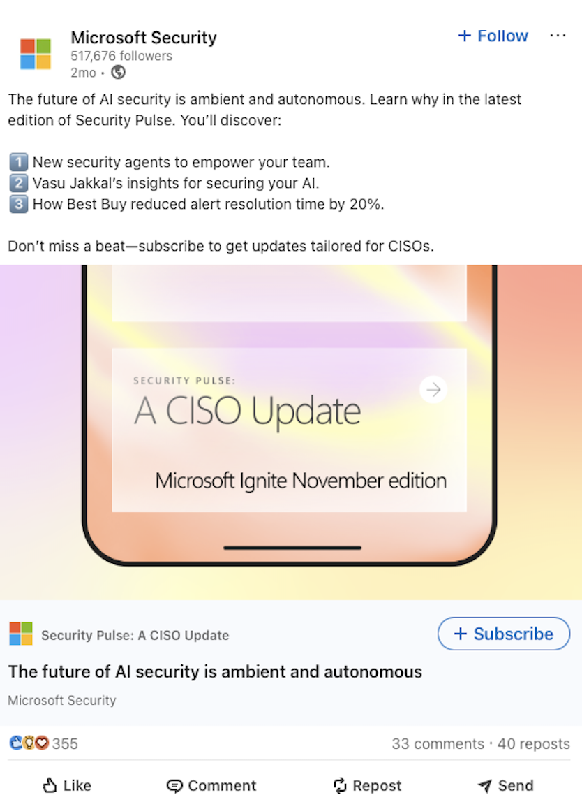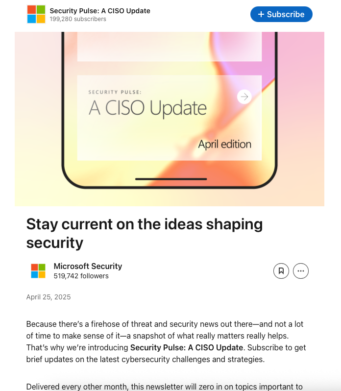 To effectively lead security operations and drive change across their organizations, Chief Information Security Officers (CISOs) need to understand the security landscape. This includes keeping tabs on emerging threats and being up on the latest thinking and best practices from security analysts and leaders. The problem? There’s just too much new information. It’s hard to know what’s fleeting and what matters, especially for a busy executive with limited time. Published bimonthly on LinkedIn, the Security Pulse newsletter addresses this problem with a snapshot of the most critical security news. I wrote three of the issues, including the inaugural one, along with the ads to promote it.