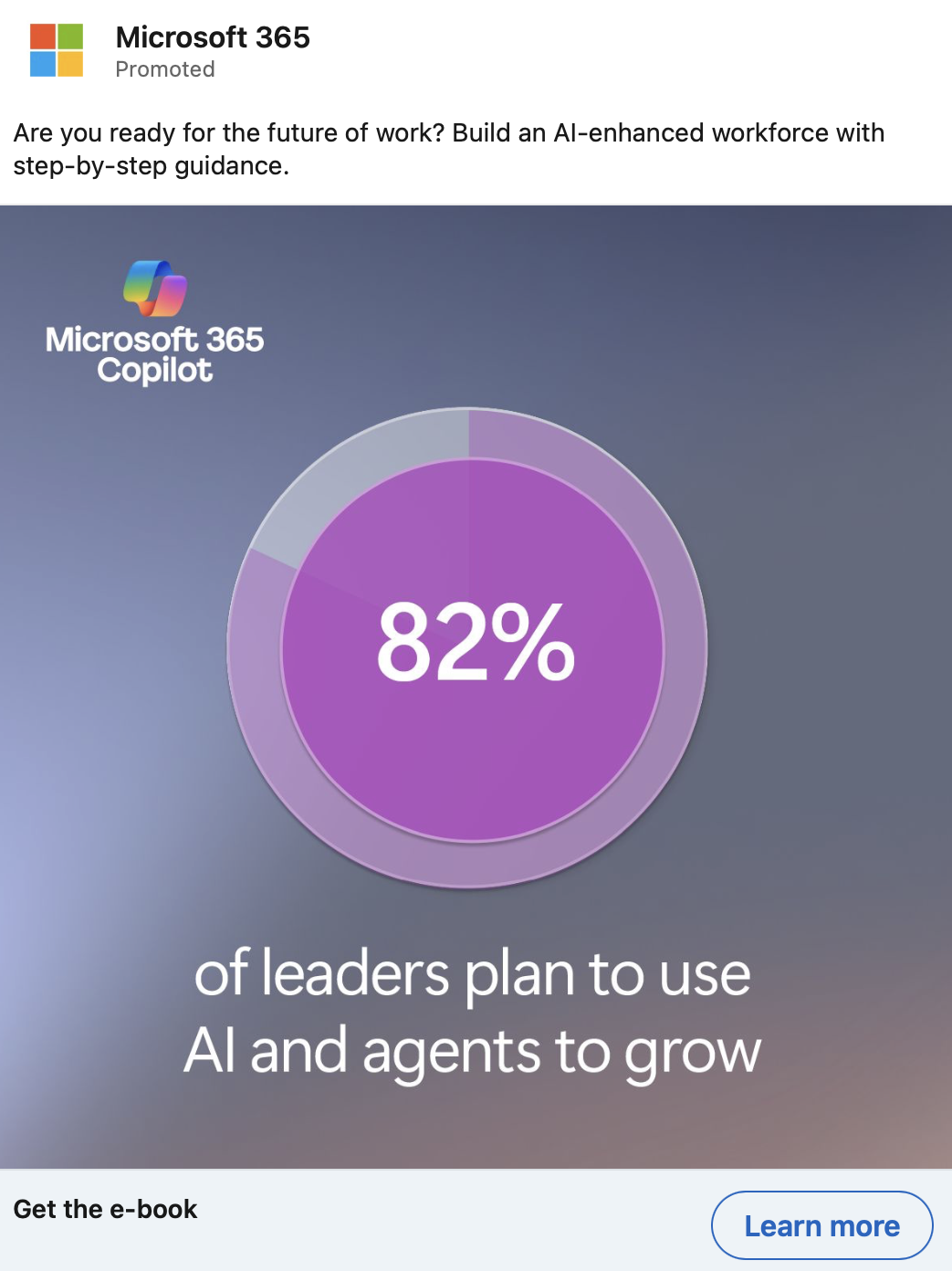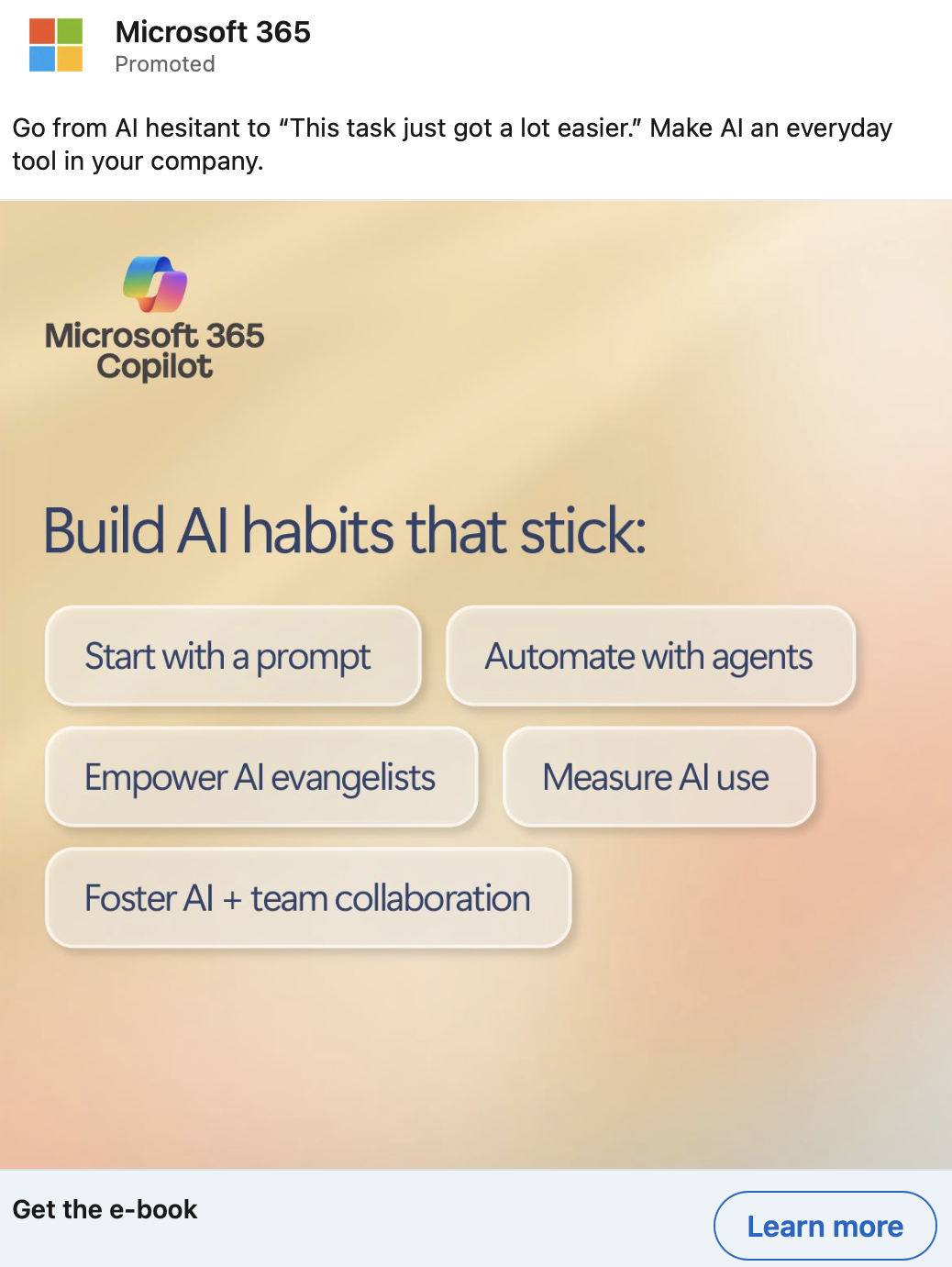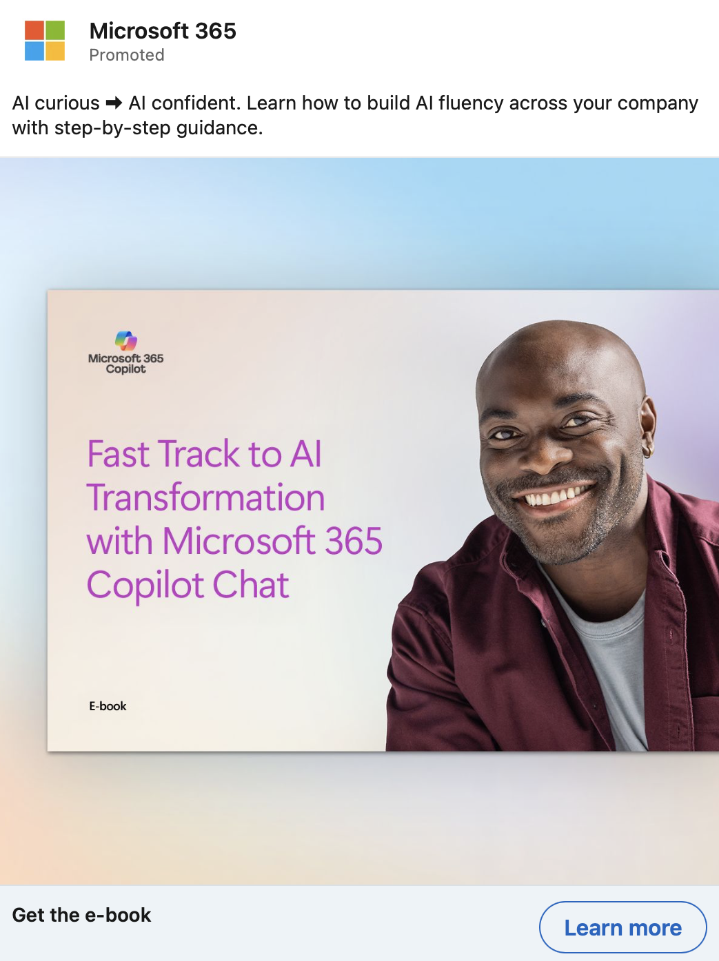 Small and medium-sized business don’t have as much money or skilled talent as larger enterprises, but that doesn’t mean they can’t implement AI across their companies. There are many low-cost, low-code tools that can help resource-strapped businesses achieve their goals. These LinkedIn ads promoted two different e-books targeted at this audience. One is about how to encourage employees to incorporate AI into their day to day, and the other focuses on how to use AI to make a difference across the entire company—not just at the individual level.