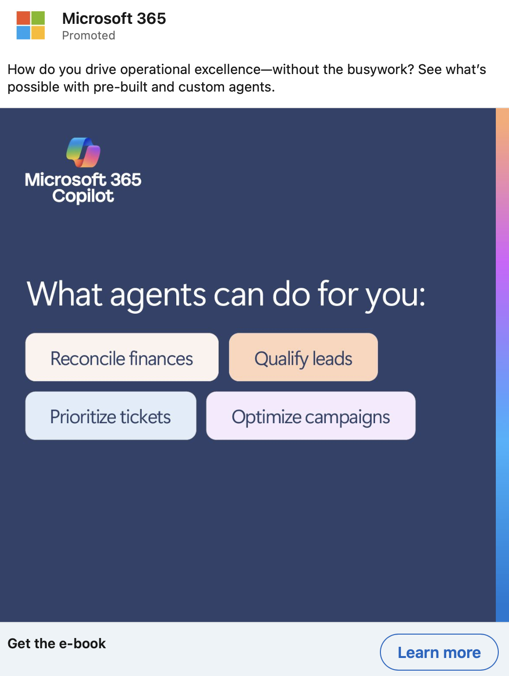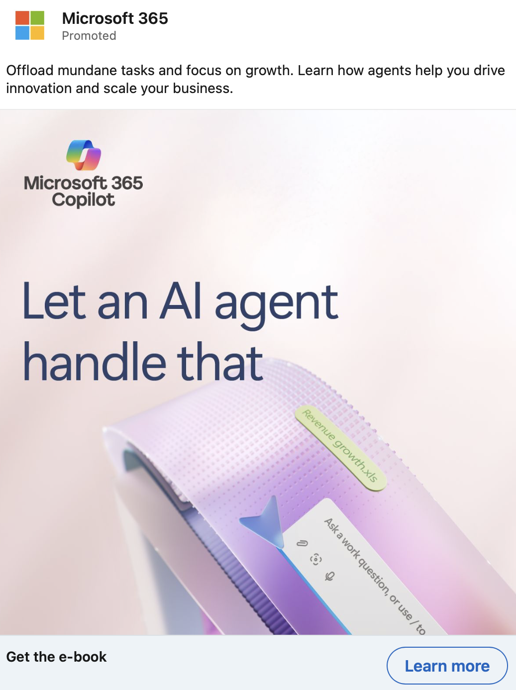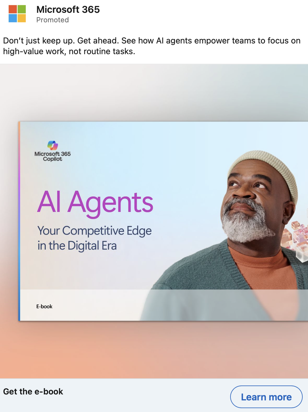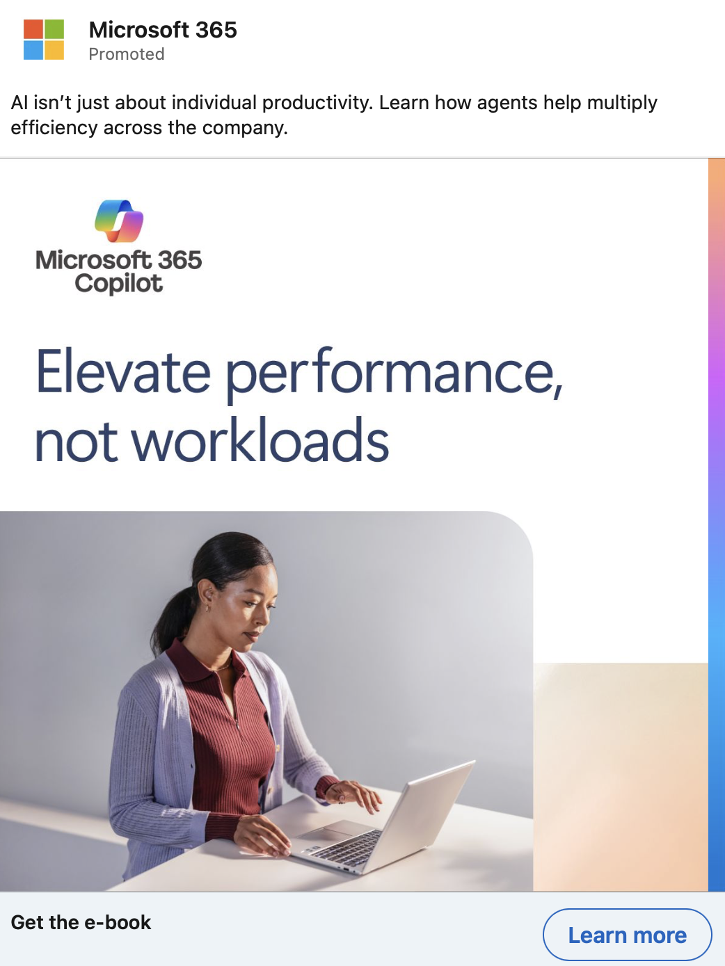 Small and medium-sized business don’t have as much money or skilled talent as larger enterprises, but that doesn’t mean they can’t implement AI across their companies. There are many low-cost, low-code tools that can help resource-strapped businesses achieve their goals. These LinkedIn ads promoted two different e-books targeted at this audience. One is about how to encourage employees to incorporate AI into their day to day, and the other focuses on how to use AI to make a difference across the entire company—not just at the individual level.